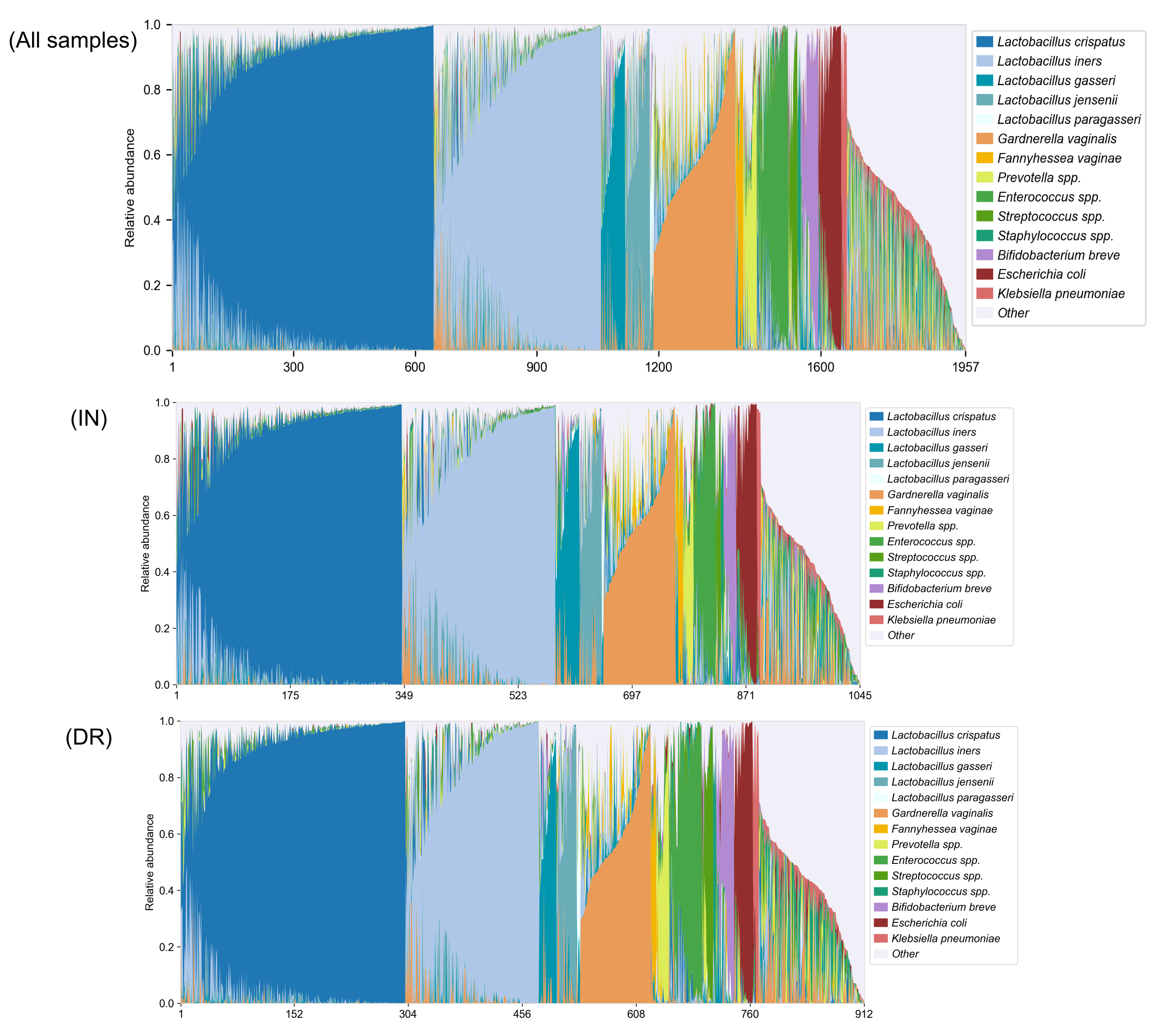 Taxonomic composition of all samples (n = 1,957) and of the subset collected at inclusion (IN; n = 1,045) and at delivery (DR; n = 912). The top 14 most abundant species are shown; all remaining species were grouped under “Other”.
