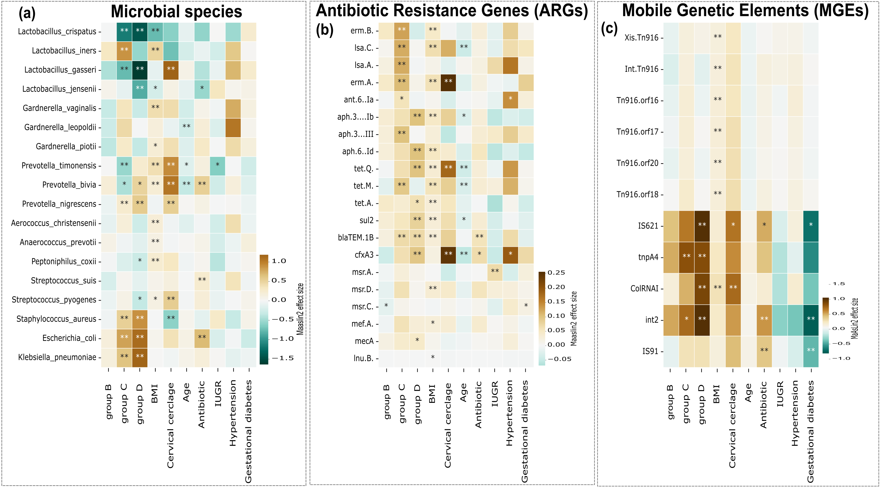 Heatmaps of MaAsLin2 effect sizes for (a) microbial species, (b) antibiotic resistance genes (ARGs), (c) mobile genetic elements (MGEs) across clinical groups (A-C), with group set as reference. A: Full Term (Control); B: Full Term Early Membrane Rupture (PROM); (C) Preterm Labor (PTL); (D) Premature Early Membrane Rupture (PPROM). This figure extends the visualization to all covariates included in the models. The color scale indicates the magnitude and direction of the effect size (positive values in brown for enrichment, negative values in blue for depletion). Significant results were annotated with an asterisk mark (* for an adjusted p-value < 0.1; and ** for adjusted p-value < 0.05)