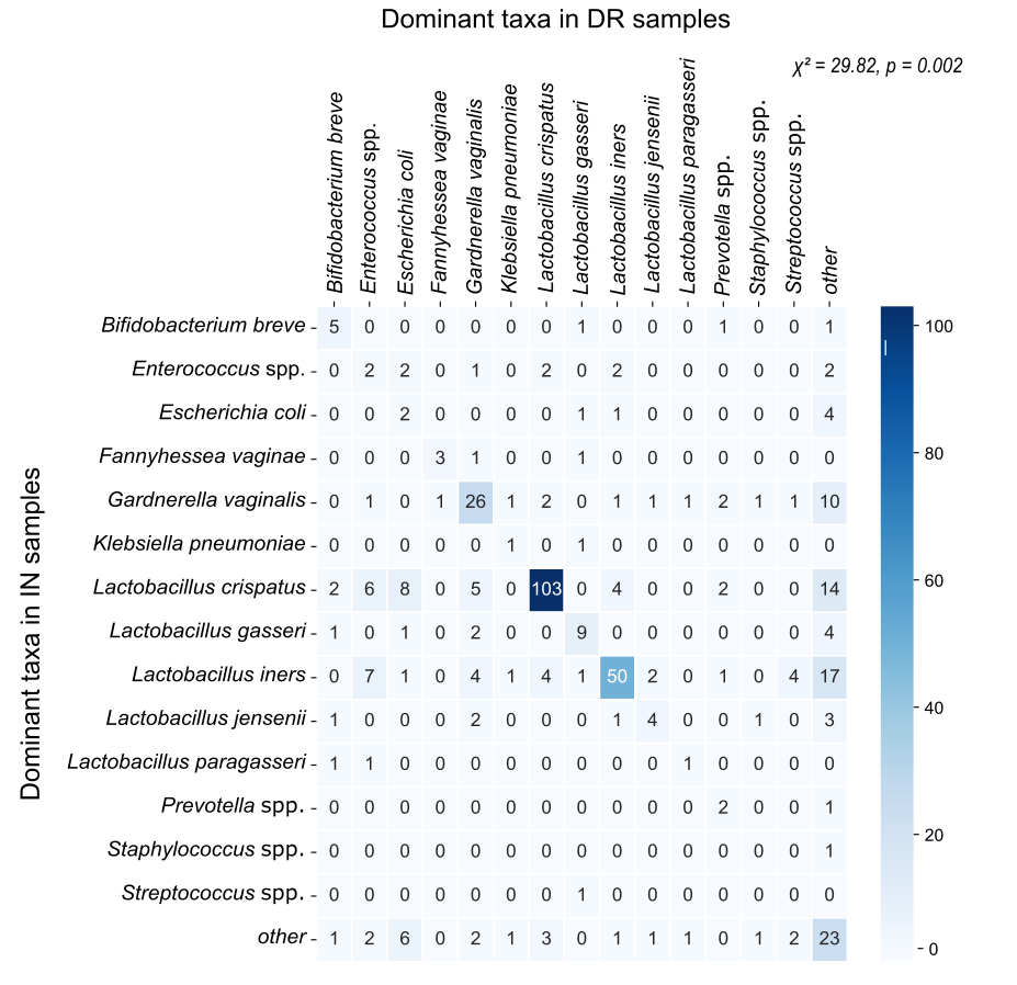 Heatmap showing the frequency transition matrix in dominant species between inclusion (IN) and delivery (DR) samples. Taxa were classified as dominant if they constituted ≥ 30 % of the profile. ‘other’ refers to the number of samples with a different dominant taxon. Rows represent the dominant species at inclusion and columns at delivery. Values correspond to the number of individuals with a given transition. Statistical significance of inter-species differences in stability rate was assessed using a Monte Carlo permutation test on the χ² statistic.