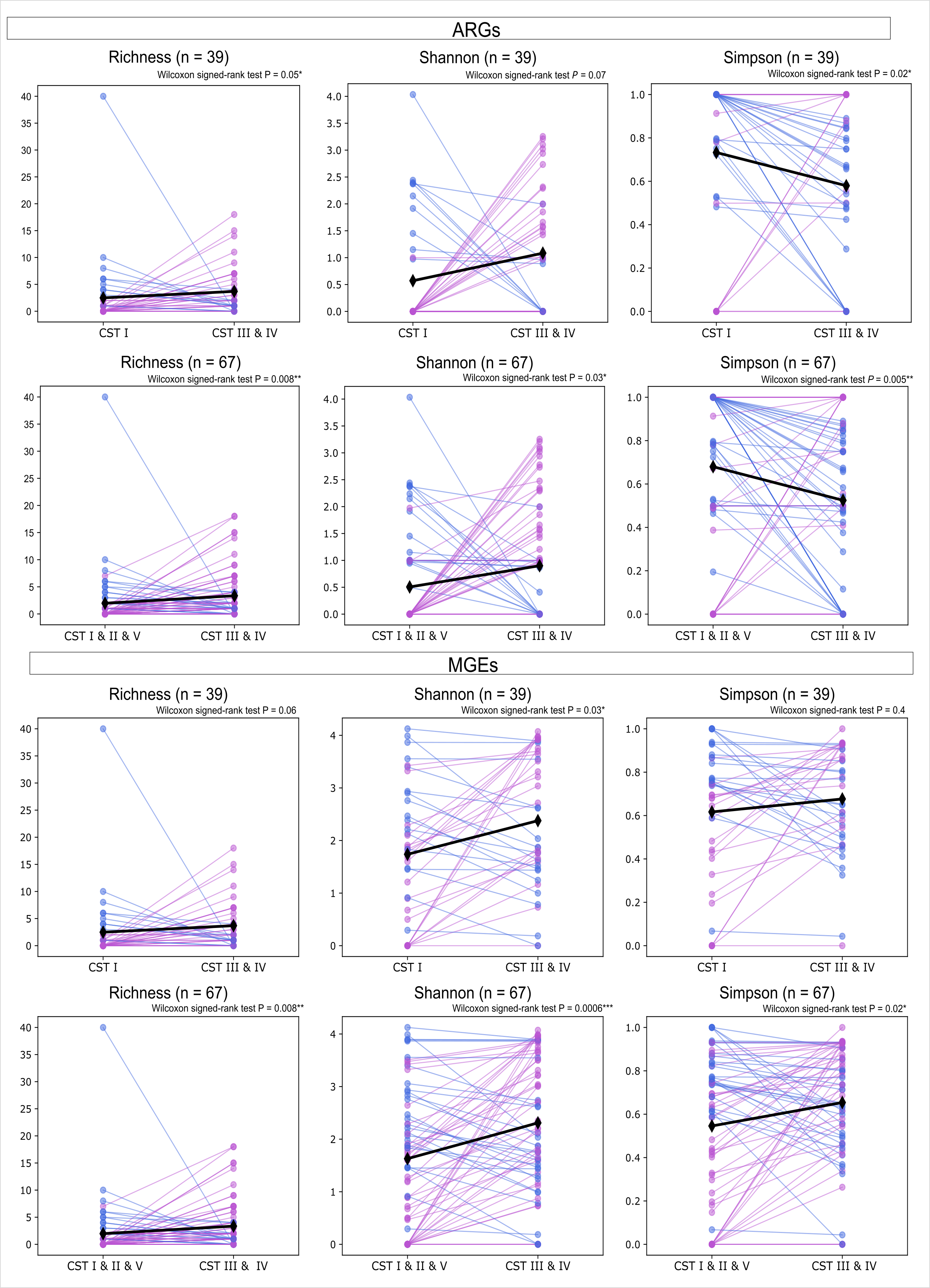 Each panel shows patient-matched diversity metrics comparing samples transitioning between community state types (CSTs): from CST I (a–c) or from CSTs I, II or V to CST III or IV (d–f).Lines connect values from the same individual. α-diversity metrics : observed richness (a, d), Shannon index (b, e), and Simpson index (c, f). Panels g–i and j–l depicts the same comparisons for mobile genetic elements (MGEs).