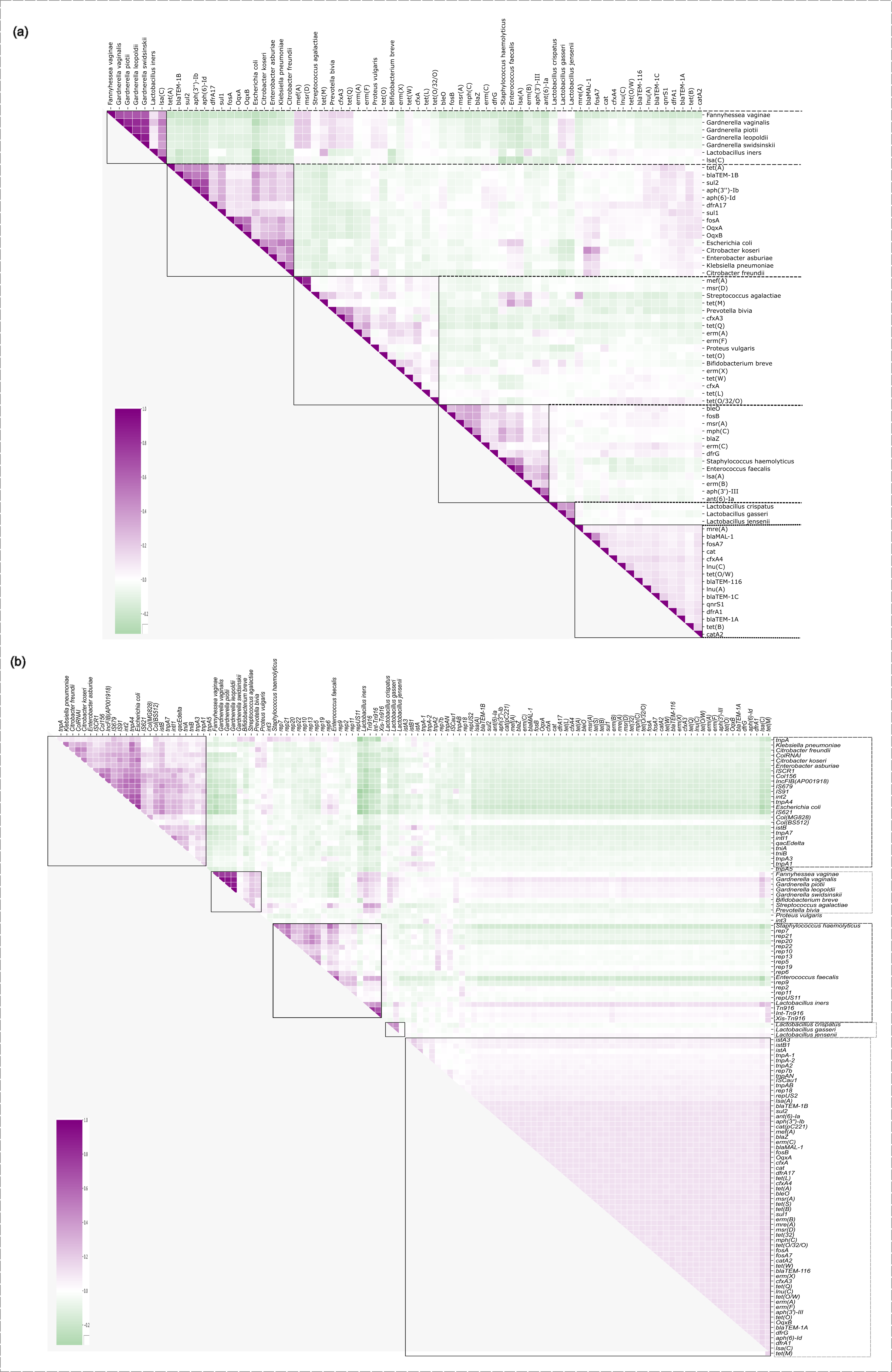 (a) SparCC-based correlation matrix between the 20 most abundant microbial species and the 50 most abundant antibiotic resistance genes (ARGs). (b) SparCC-based correlation matrix beetween the same microbial species and the 50 moste abundant ARGs and mobile genetic elements (MGEs). Matrix was clustered with the “average” linkage method.
